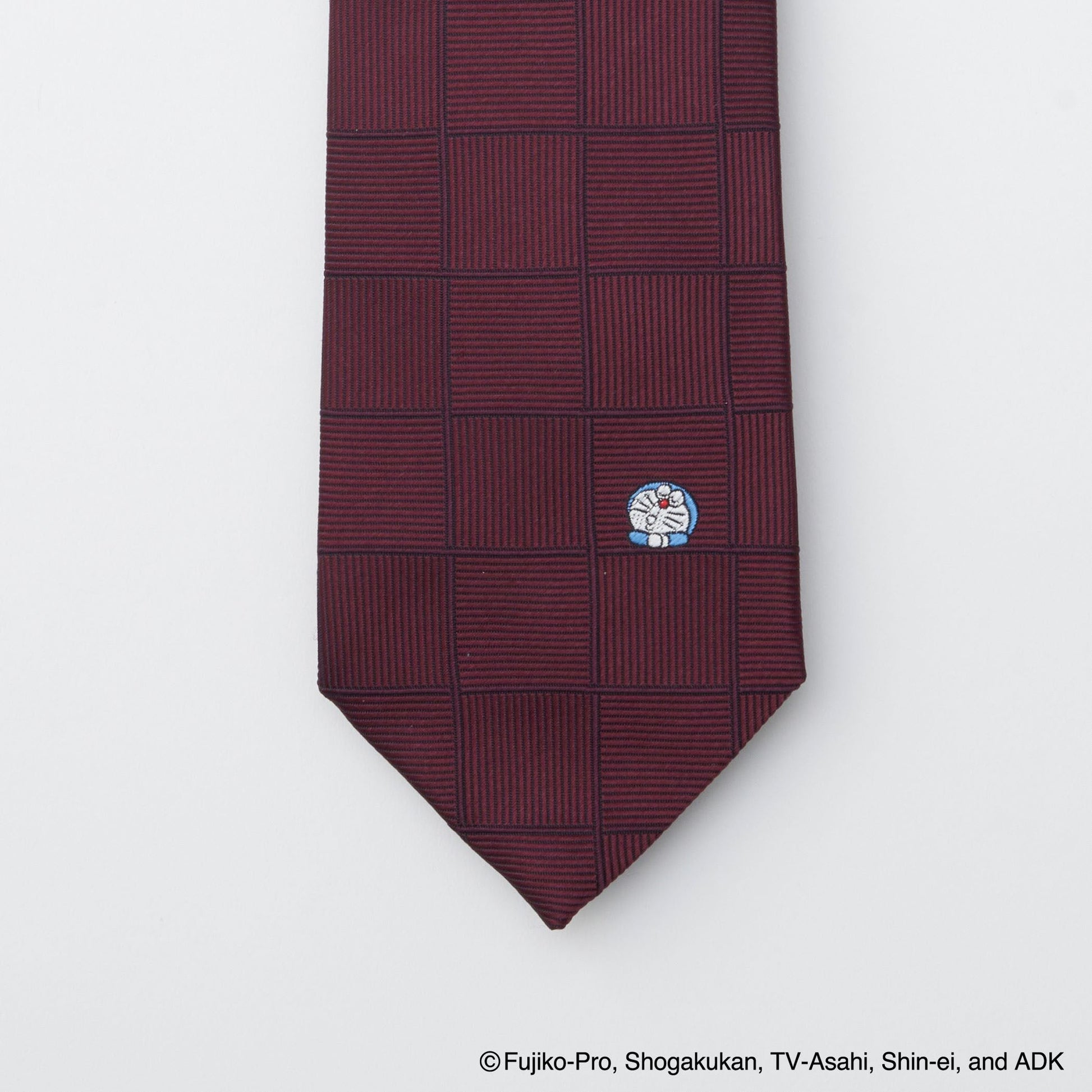 シンプルなスクエアパターンを窓枠に見立てて、気持ち良さそうにまどろんでいるドラえもんをワンポイントにしたネクタイです。うたた寝しているのかな・・・。上着の前をしめると、シンプルなソリッド(無地)のネクタイに見えるのも魅力です。