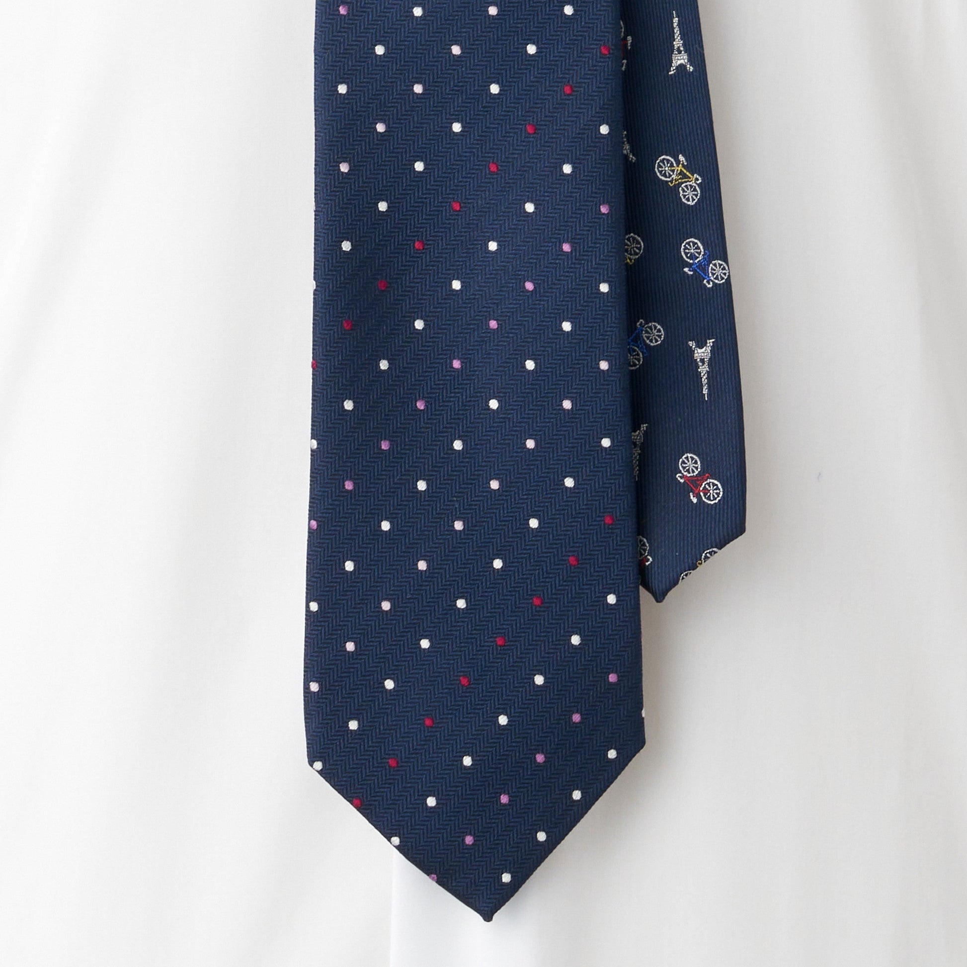 2025年春夏シーズンのクレリックタイは、タケオキクチに縁のあるフランスからインスピレーションを受けてデザインされました。大剣はベーシックなドット柄、そして小剣にはフランスの象徴であるエッフェル塔や、スポーツを連想させる自転車のモチーフを繊細にあしらっています。フランスオリンピックの余韻も感じさせる、特別な一本です。